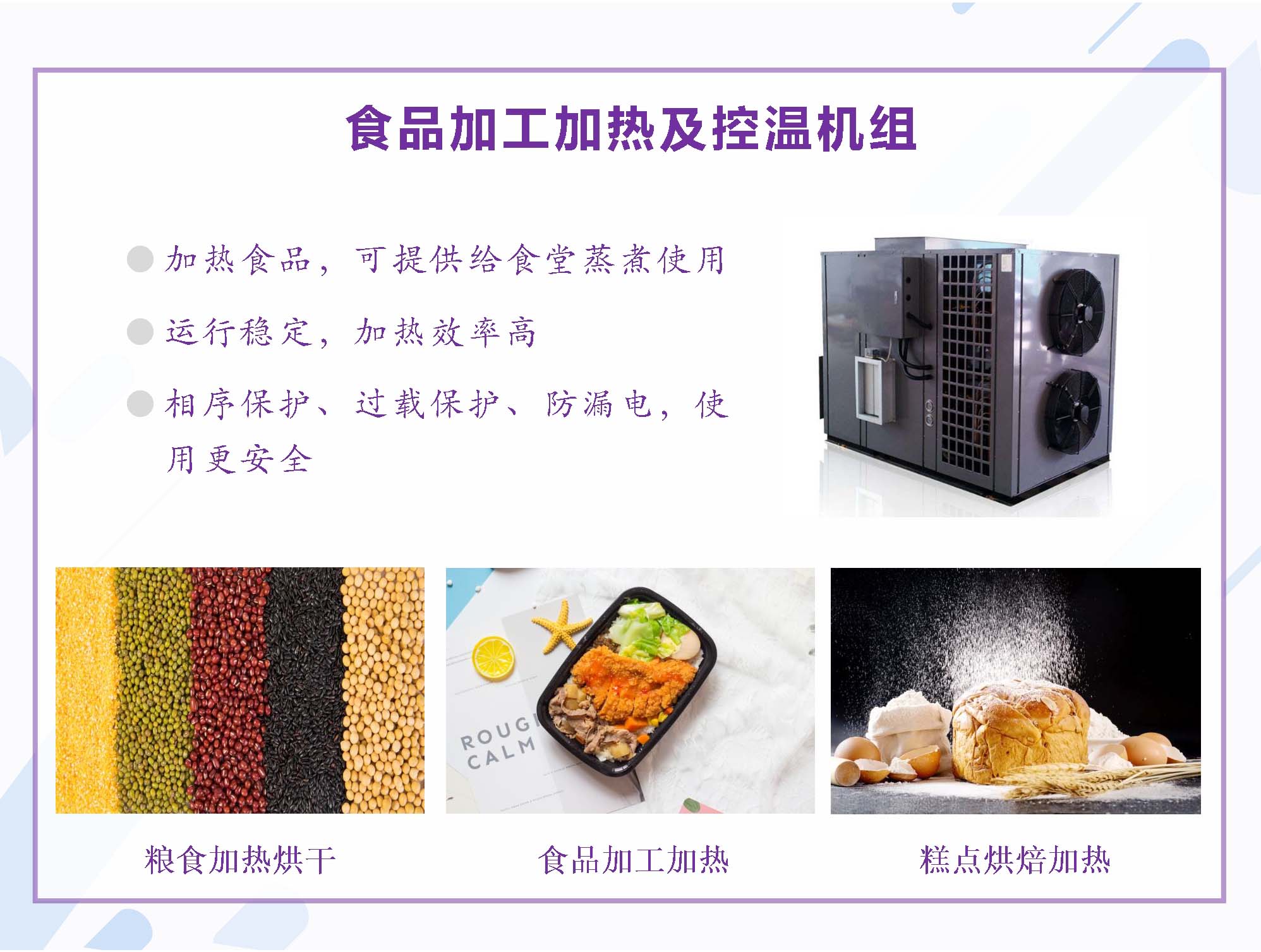 空气源热泵系列 余热回收系列 烘干系列 农业养殖、海产养殖相关行业控温机组 肉类缓化及食品加工工艺控温机组 智能化冷冻、冷藏节能系列